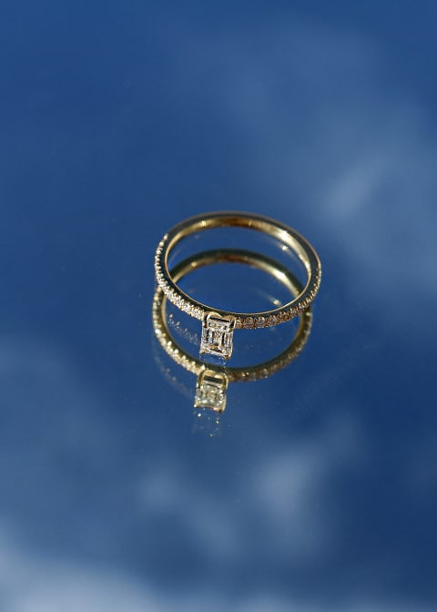 18 carat yellow gold ring set with a 0,45ct emerald cut diamond (F color, VVS2 clarity, GIA certified) and paved with natural brilliant-cut diamonds (F+ color, VVS clarity)