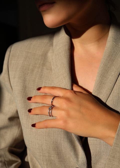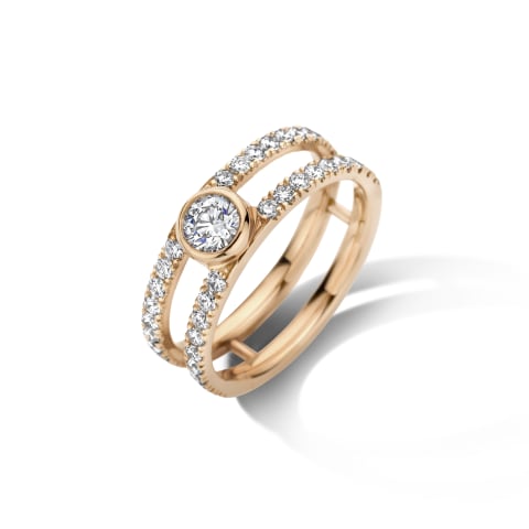 18 carat rose gold double band ring set with a 0,31ct round cut diamond (color D, clarity VVS2 certified GIA) and paved with natural brilliant cut diamonds (color D, VVS clarity)
